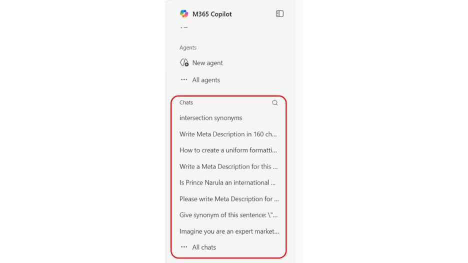 Microsoft Copilot: In Microsoft Copilot as well, the saved chats appear on the left sidebar. You can search for any chats using the search bar. Just like ChatGPT, if you want to delete or rename any chats, you can do see by selecting the three dots appearing on each chat. You will also find a list of your AI agents on the left-hand side. (Check our blog on “Runner.H”, a revolutionary platform to create AI agents.)