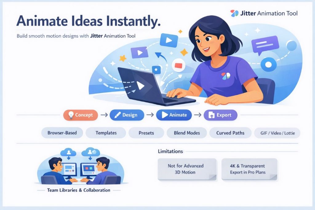 Jitter is a browser-based animation tool that makes motion design accessible for designers. Its interface feels instantly familiar to anyone with Figma experience, making it easy to jump in and start animating quickly. With templates, presets, and creative features like blend modes and curved paths, Jitter helps teams create animations for ads, social media, landing pages, and UI in minutes.