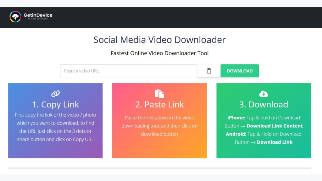GetInDevice also provides a downloading app along with a web downloader. Just like its web utility, the app also works seamlessly with nearly all social media channels. So, you don’t need to install separate apps for each video-hosting site. Instead, just get this app and start your video-saving journey to create a personalized collection of offline clips.