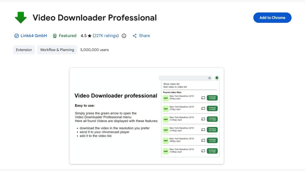 Video Downloader Professional is one of the highest-rated extensions available on the internet. The reason why users like it so much is that it doesn’t keep you waiting for downloads. As you install it on your browser, you can instantly go to the page where the clip is playing and click its icon in the toolbar to view downloading options.