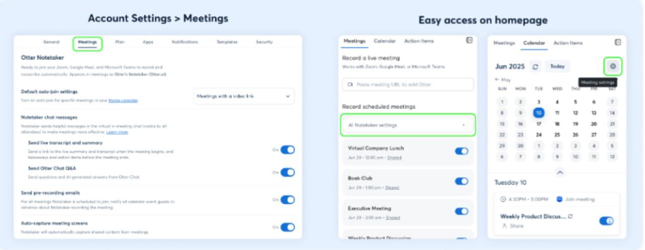 - Go to account settings, then go to meetings, and then access all the Notetaker settings including auto-join.