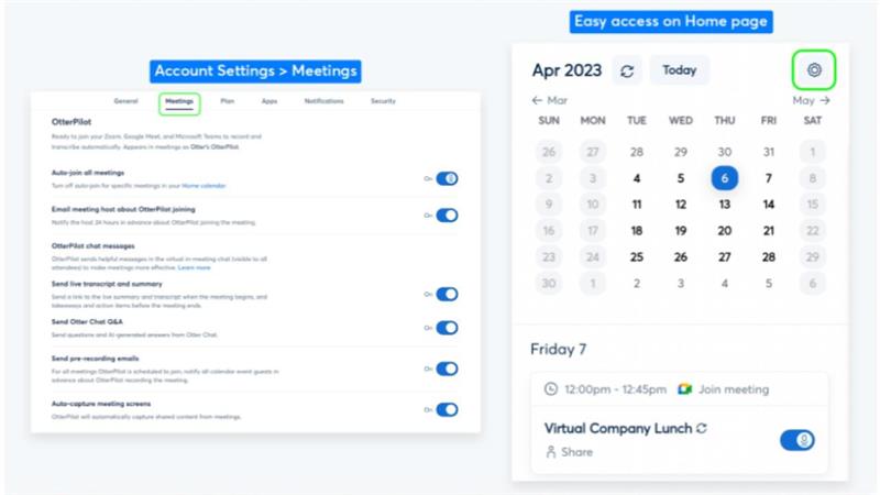 1. You can find all your Notetaker settings by going to Account Settings and then selecting the Meetings Page. You can also select a gear icon available on the Homepage Calendar.