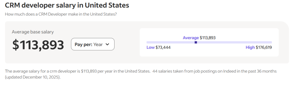 The salary of a CRM developer varies between $73,444-$176,619. The average salary of a CRM developer exists around $113,893/year.