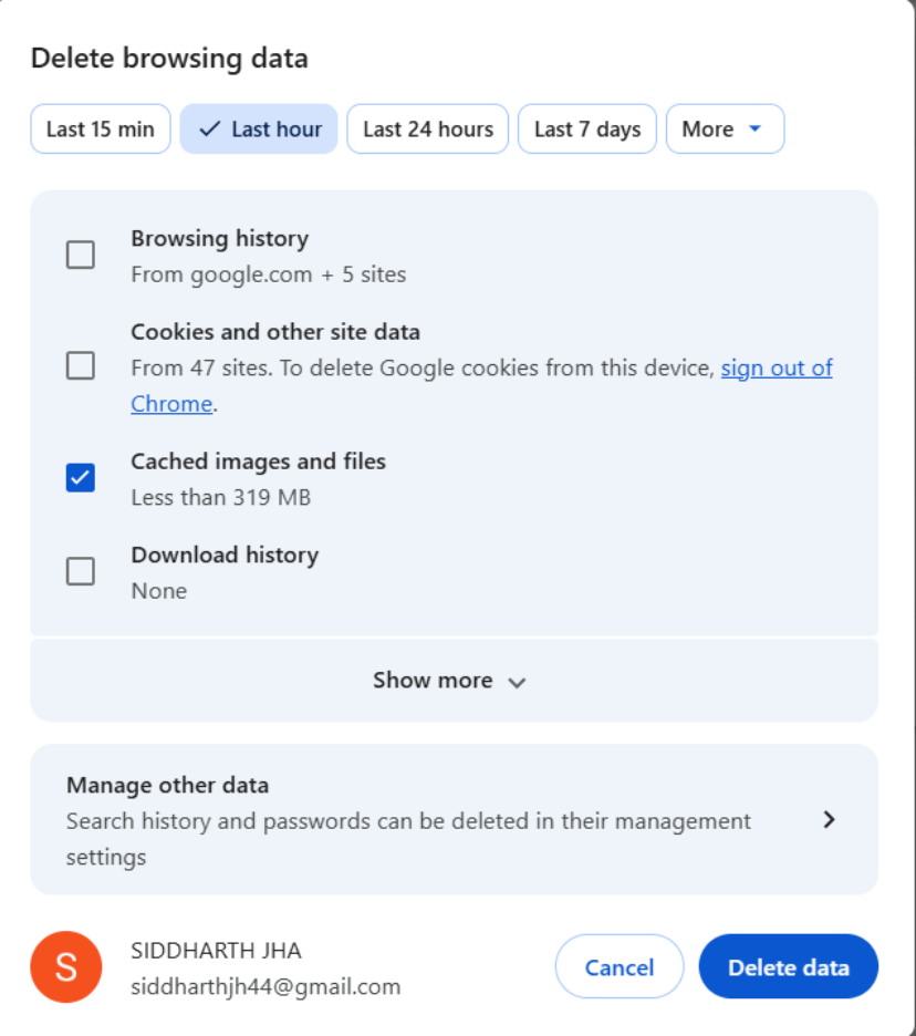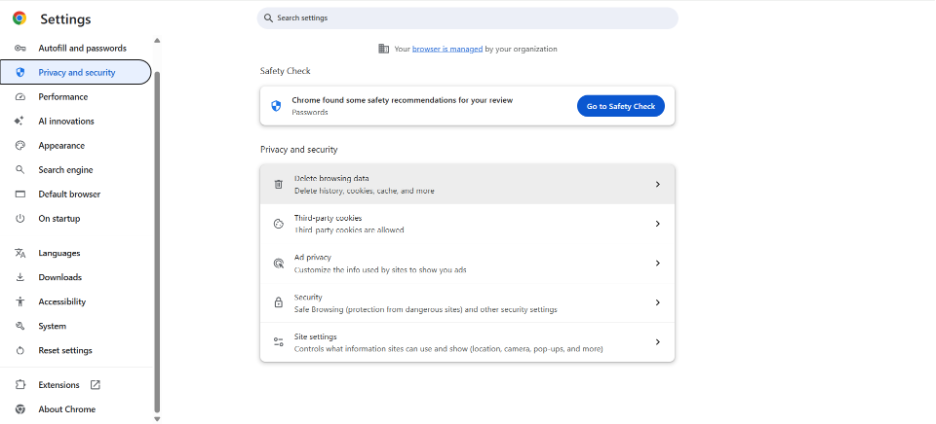 • In Chrome: Go to Settings, then choose “Privacy and Security,” and after that, select “Delete Browsing Data.”